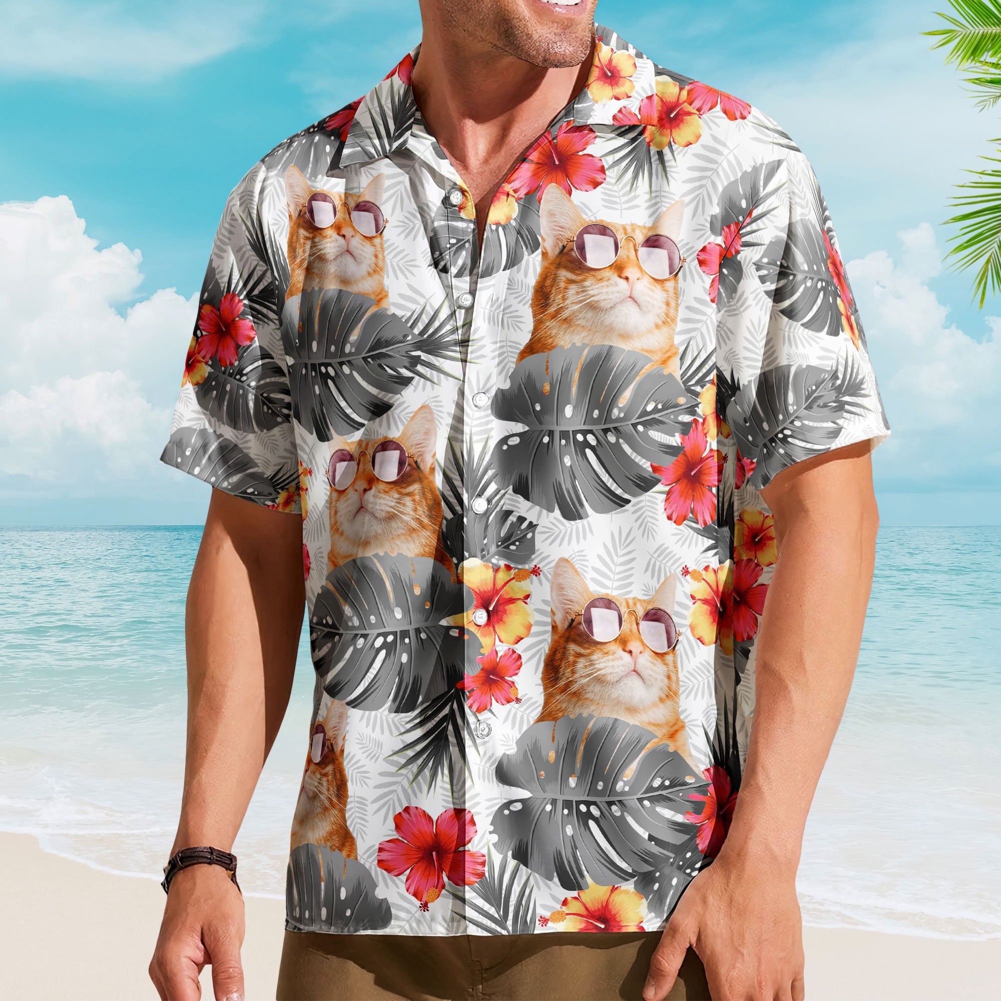 Ideal for gifting, the Personalized Photo Aloha Shirt is a thoughtful and humorous present for your boyfriend, husband, dad, grandpa, boss, coworker, papa, or any beloved men, women in your life. The shirt is adorned with beach fruits, flowers, and playful elements, making it a one-of-a-kind statement piece.